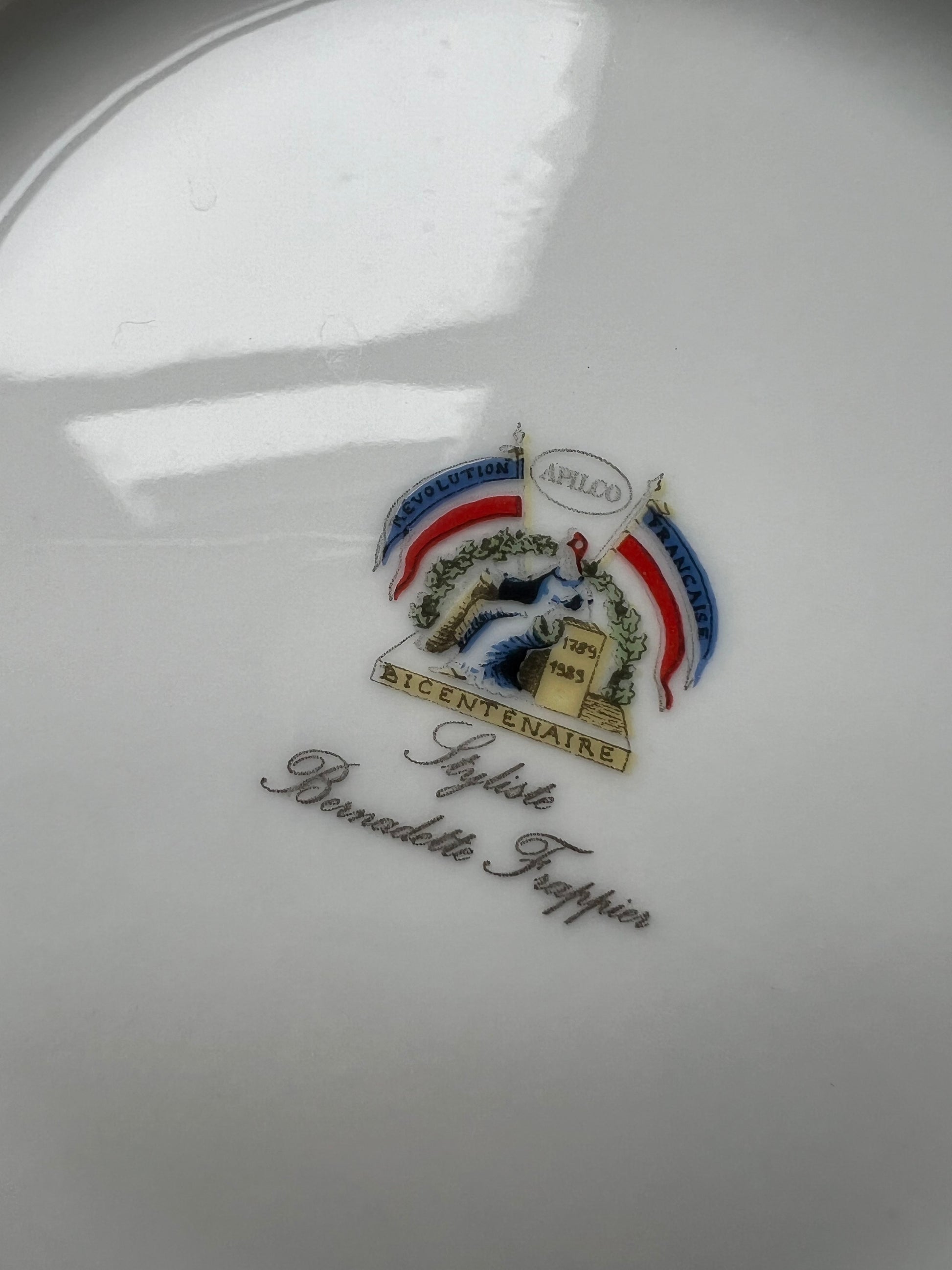 From Styliste Bernadette Frappier, these plates are from 1989 and show 5 unique scenes celebrating the bicentennial of the French Revolution. Scenes include Declaration of the Rights of Man, The General States, Storming of the Bastille, Execution of King Louis XVI and The Abolition of Privileges.