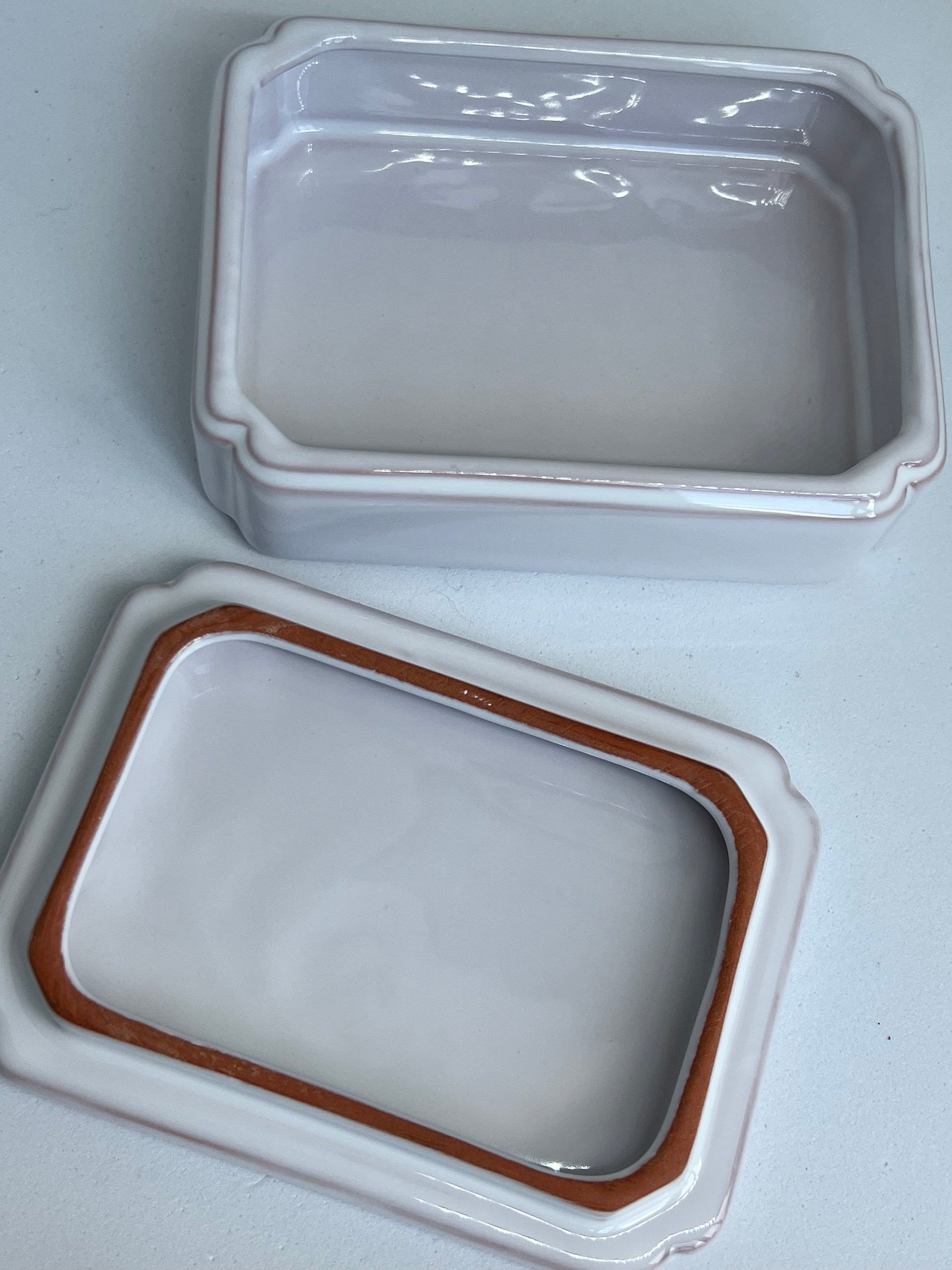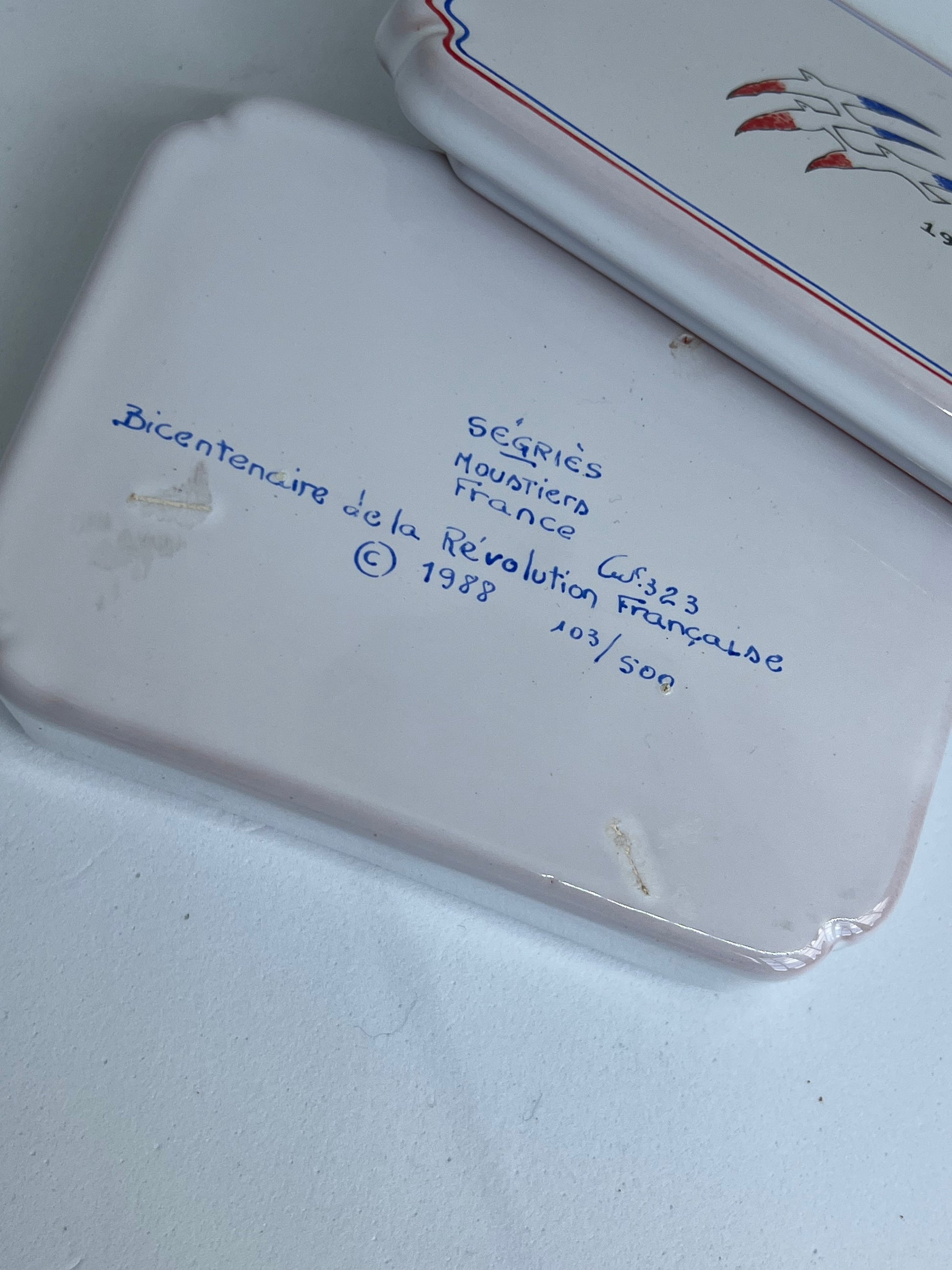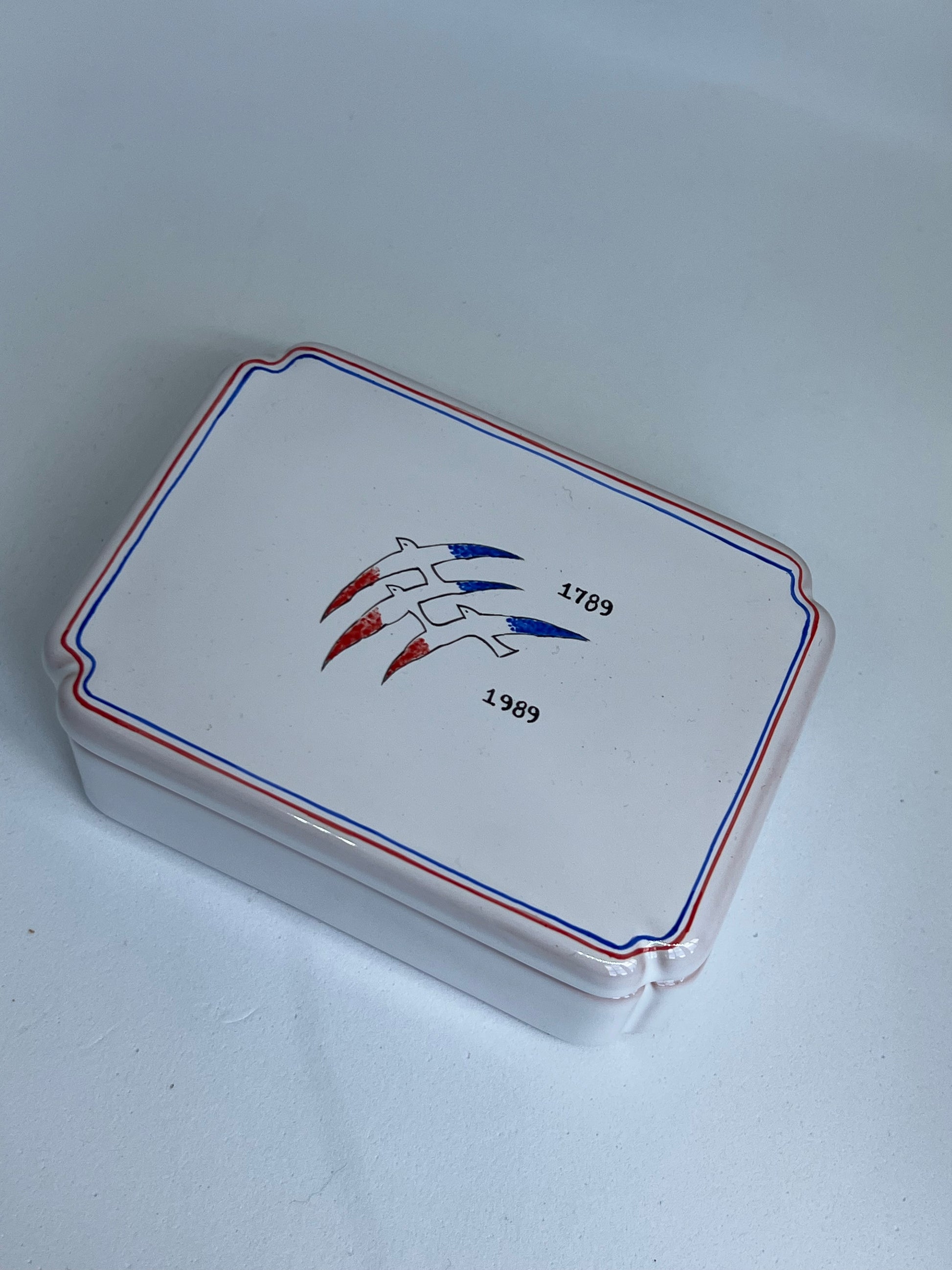 Very sweet petite box from the Bicentennial celebration. Hand painted in 1988, this is one of 500 made in Moustiers in the Provence region of France. Use to store matches, jewelry or tiny slips of paper inscribed with your secret wishes! Style on top of a stack of vintage books or on a mirrored vanity tray. Magnifique!