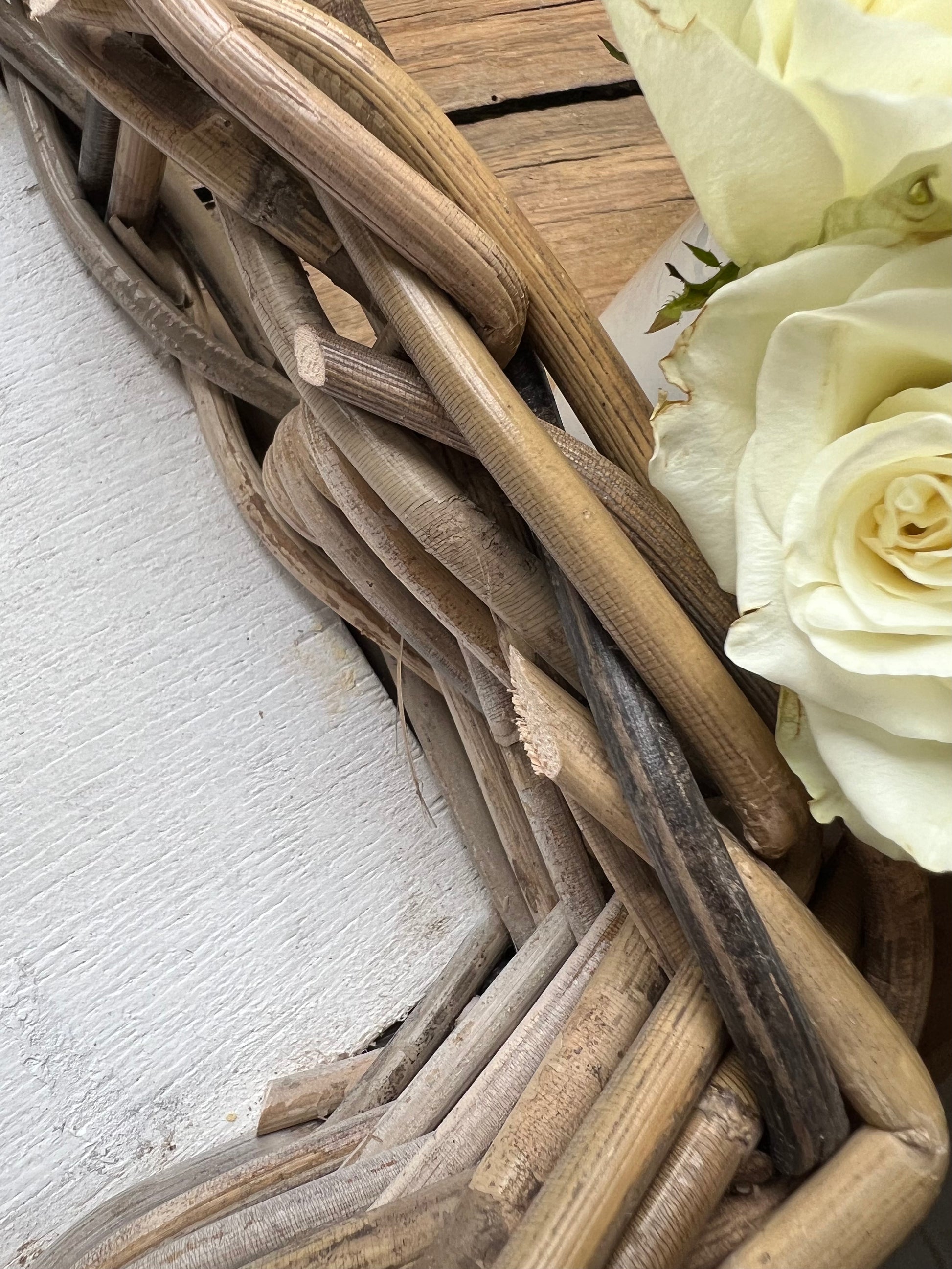 This wicker serving tray has a white wooden base and is extremely sturdy. Mimi's eyes rolled all the way back into her head when she found this tray. She uses hers on display in the kitchen to have at the ready to serve anyone who steps near a lovely tray of drinks and snacks and receives so many complements she can't keep these in stock! She has so far given 3 away to visiting friends! Tray measures approx. 10 x 17 inches by 3 inches tall.