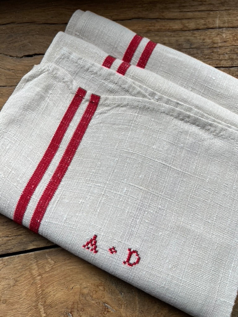 Perfect for the kitchen, in traditional white linen with red stripe. Embroidered with a personalized A & D. Are those your initials? Lucky!