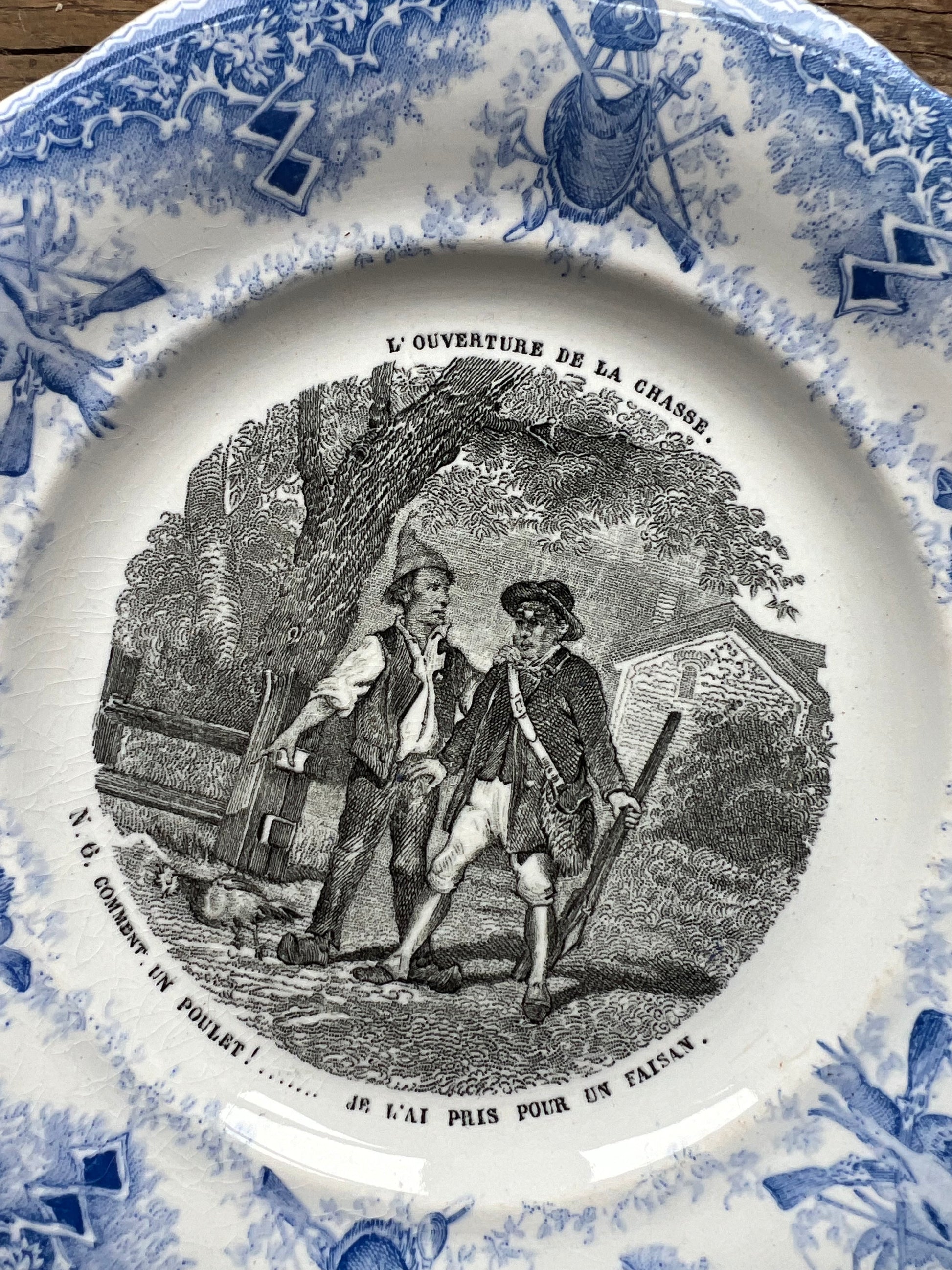 Charming set of four blue & white dessert plates with scenes of "La Chasse" -- The Hunt. Plates are numbered 2, 3, 5 and 6.