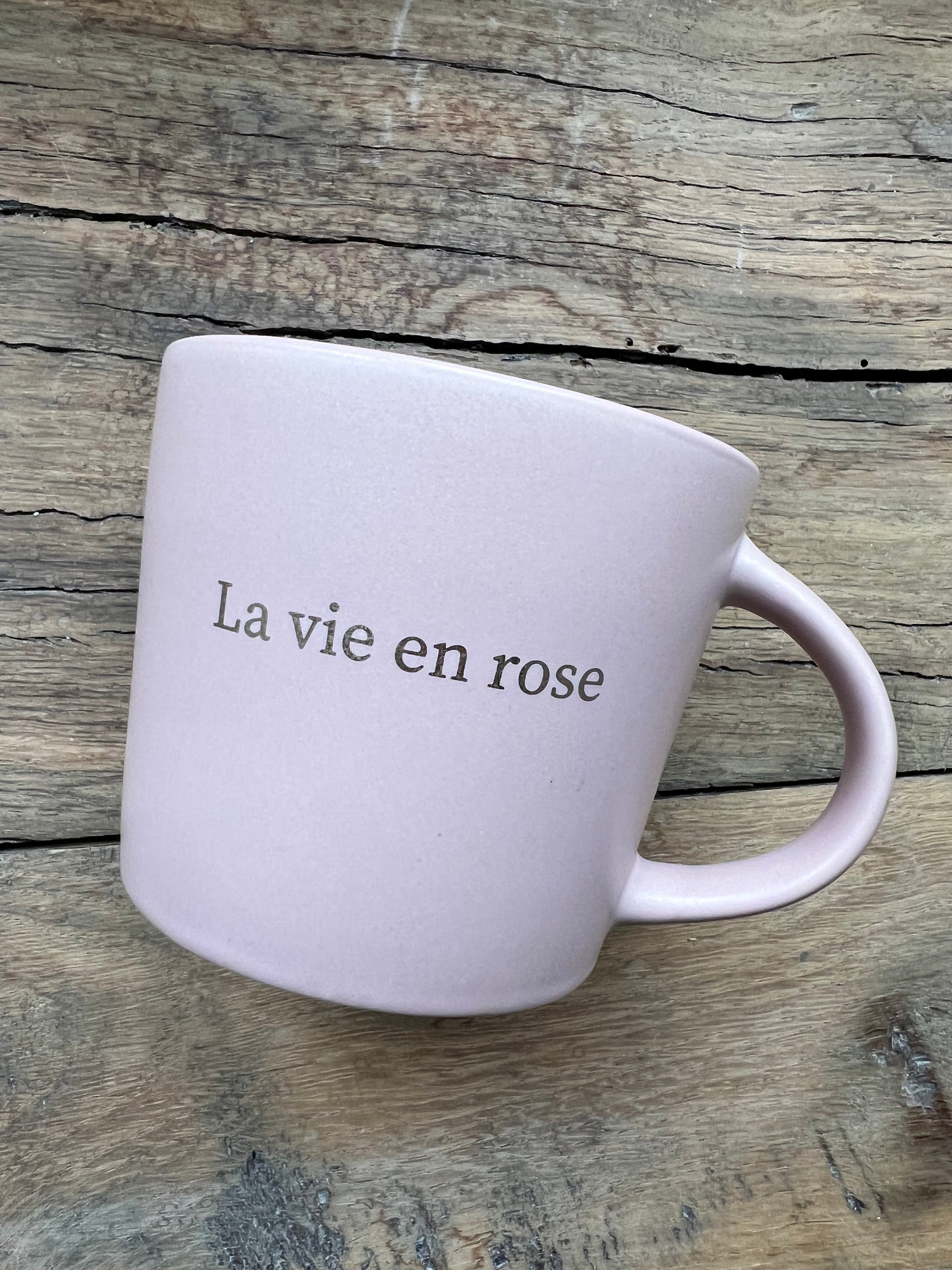 Beautiful day coffee cup is creamy rose pink with gold lettering. A beautiful way to start the day!
