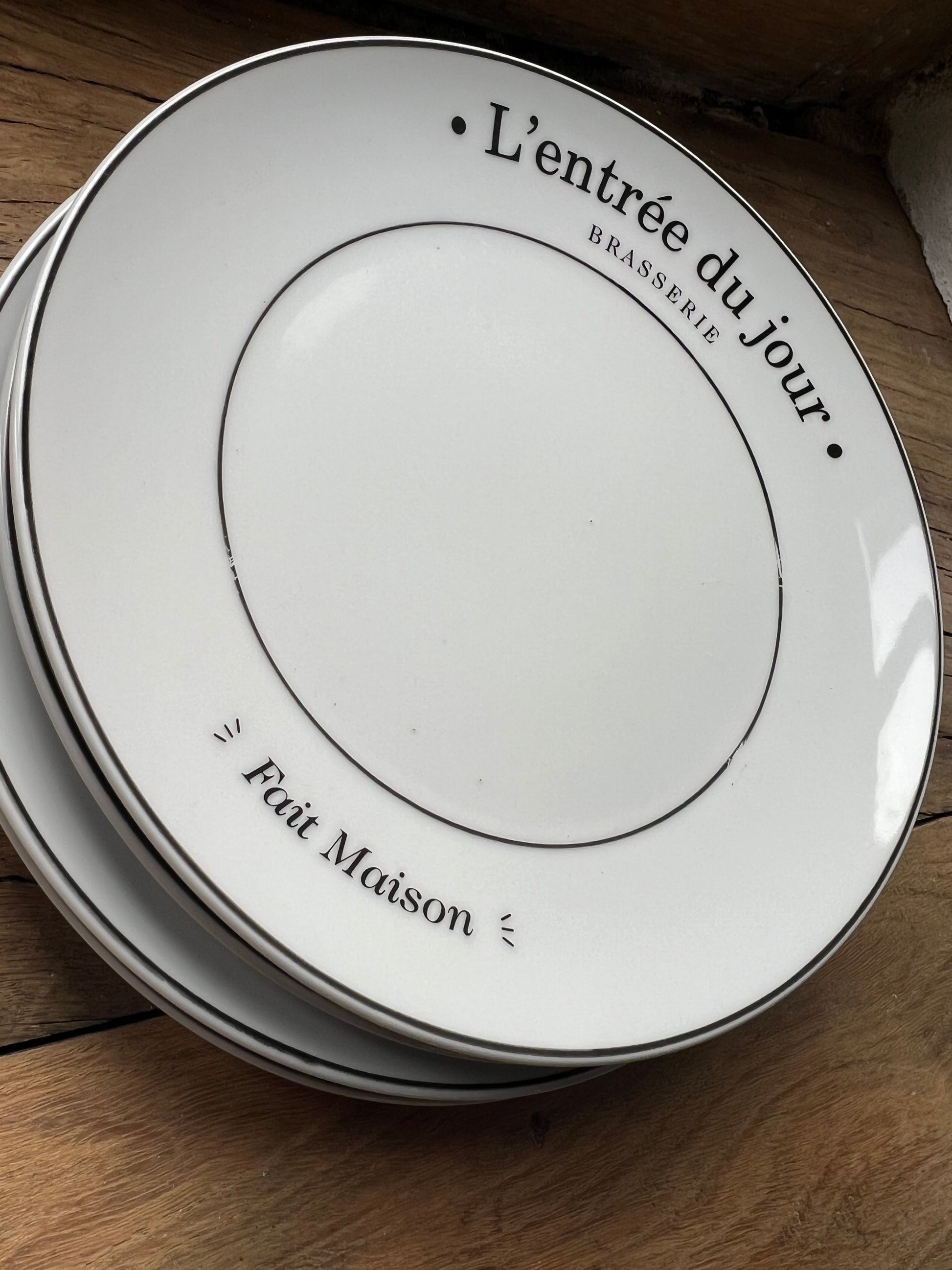 Starter of the day/house made entrée plates. These black and white classic Brasserie entrée plates give a special extra touch to your home cooked meals. Microwave and dishwasher safe. Bonus! Sold in sets of 2.