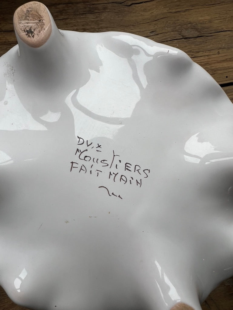 Traditional hand made pot from Moustiers, France. These pots were used to serve a wide variety of jams, confits and the like at the court of Louis XIV as part of elaborate meals and displays, with large-scale vessels incorporated into the Baroque garden designs of Versailles. Artisans in Moustiers developed innovative vessel shapes and decorative motifs prized among collectors throughout Europe.
